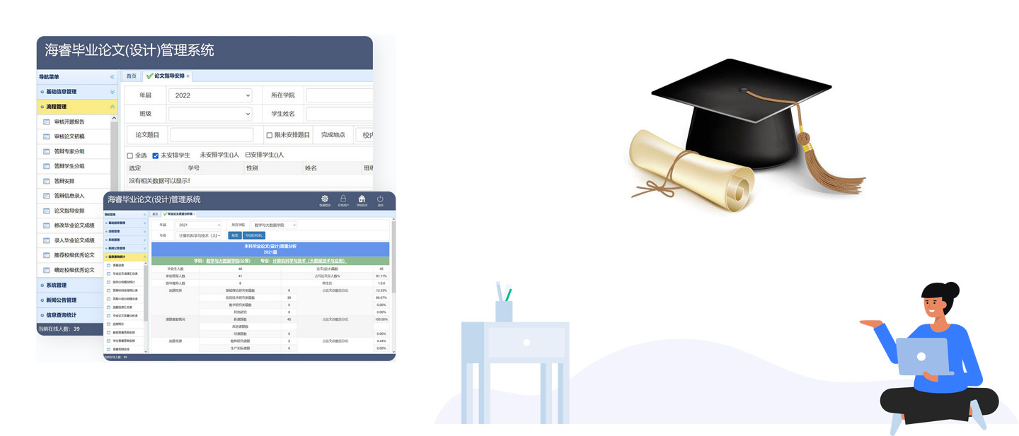 《海睿高校毕业论文(设计)管理系统》是一套基于B/S架构的信息管理系统,提供从论文题目征集、网上选题、下达任务、论文开题,论文提交、师生交流、论文审阅、答辩安排、进度检查等环节的管理功能,实现了高校毕业论文(设计)全程网络化、智能化管理。